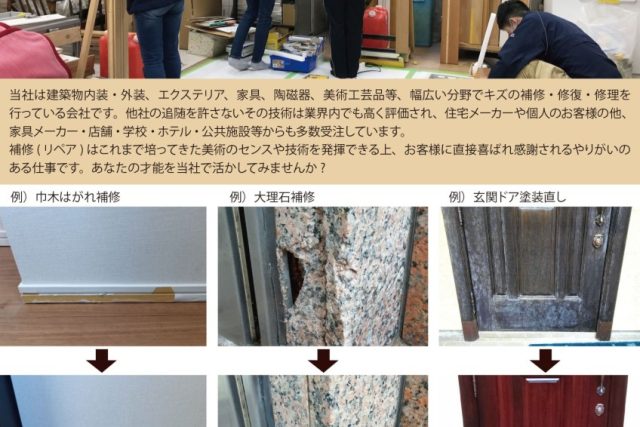 住宅のリペアを継続する中で、家具から美術品の補修まで行えるようになり、現在は特殊作業や