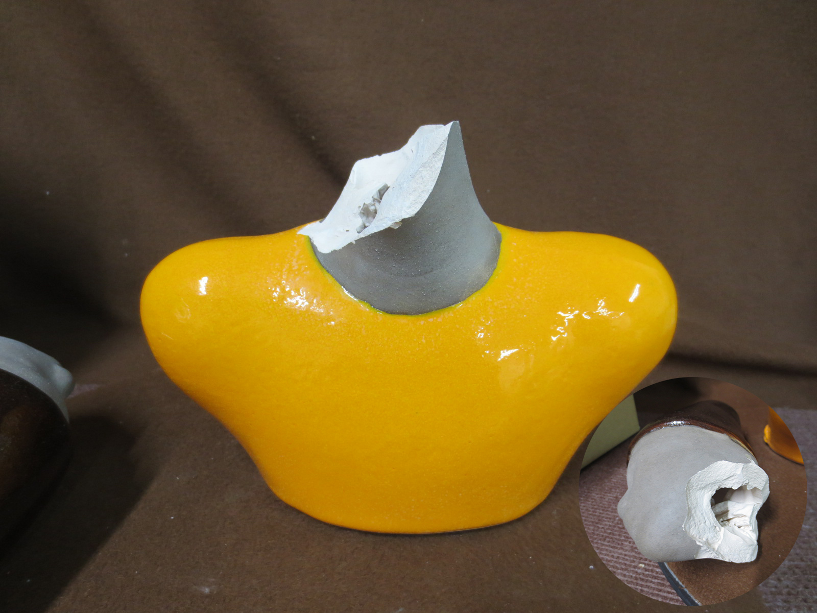 一度折れたものは少しの負荷で再び折れやすくなっているため、オブジェの内側に補強を施して折れにくくしてあります。次に補修材を充填・研磨して隙間を埋め、彩色・艶合わせをしてつなぎ目が全く分からないよう仕上げています。