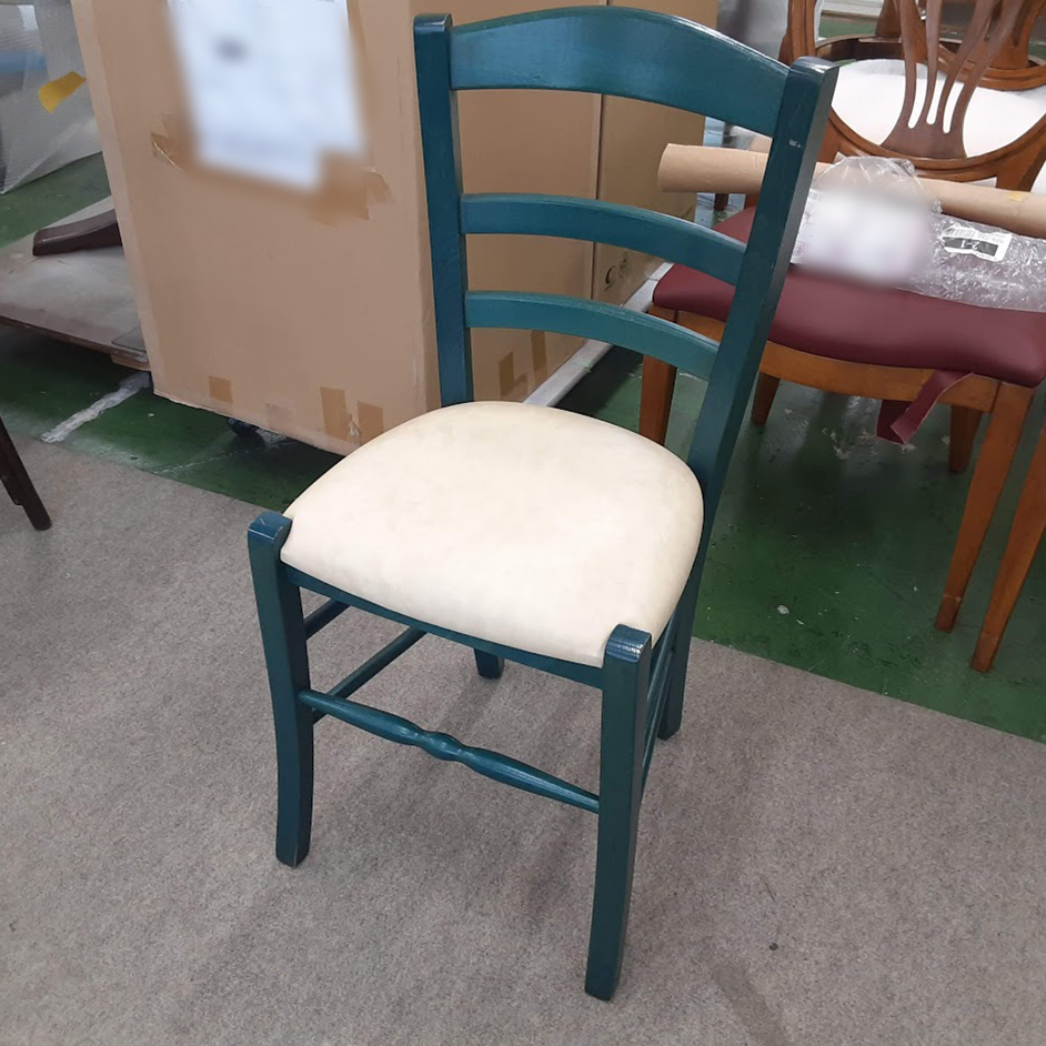 1脚目はペーパーコードの椅子を生地張りに変更致しました。傷んだペ-パーコードは取り除き、座板を新しく取り付け、その上にチップやスポンジでお好みの硬さに調節した座面の中身を製作、、自然な生成り色の椅子生地を張っています。