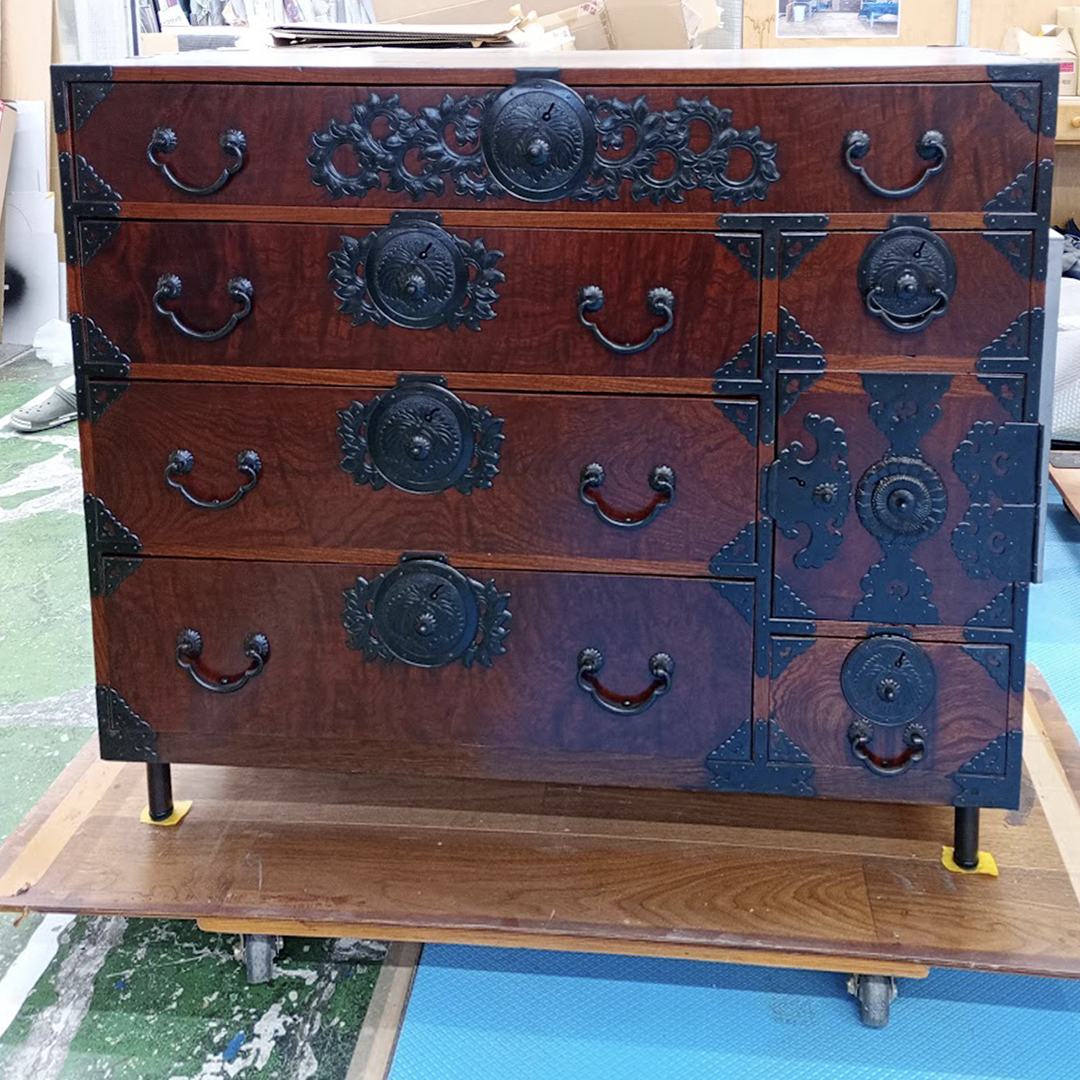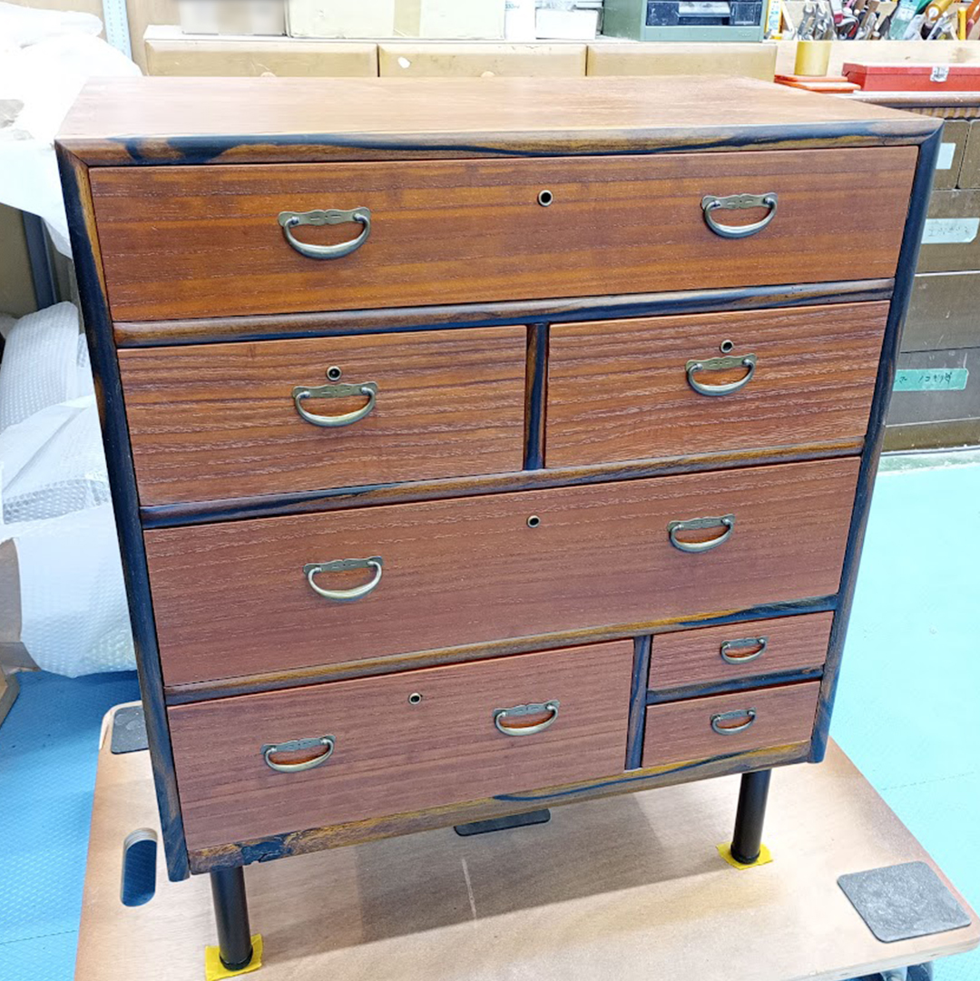 丁寧に金具を取り外しクリーニングできれいにした後、必要に応じて剥離や塗装を行い、修理・修復・補修いたしました。お施主様のアイディアで背の高い2段の桐箪笥は分割して低くし、それぞれに脚を取り付けました。