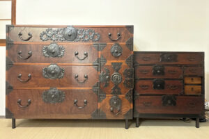 上記の”仙台箪笥と時代箪笥を今の暮らしに合わせてリメイク”のタイトルでご紹介させていただいたお施主様の桐箪笥のリメイクをご紹介いたします。こちらが元の桐箪笥2棹です。一段の桐箪笥は枠が希少な黒柿で造られています。