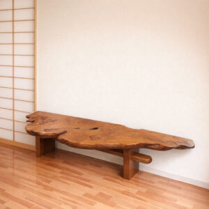 銘木衝立のローテーブルへのリメイクをご依頼いただきました。壁付けで使いたい、使い勝手や安全面からでっぱりをカットしてほしいとのご要望で、一辺を直線でカット、残った部分から脚、貫をとります。