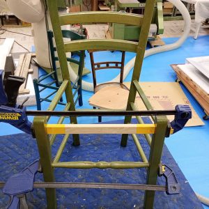 破断した背もたれ直しと全体的にガタが来ていた木組み部分のがたつき直しを修理いたしました。