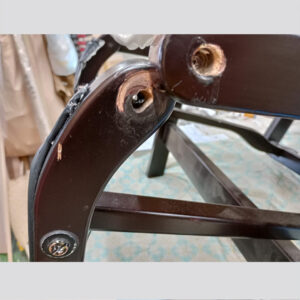 背もたれ・座面・フットレストは土台のワイヤーにゆがみが発生していたため、ゆがみを直し、今後ゆがみにくくなるよう補強も行っております。リクライニング機能部は金具が破損、安全性を考慮して金具は新規で製作し取り付けております。また、フットレスト可動部もボルト穴が摩耗してゆるみの原因となっていたため、修理と補強でゆるみなく滑らかに動くよう調整いたしました。