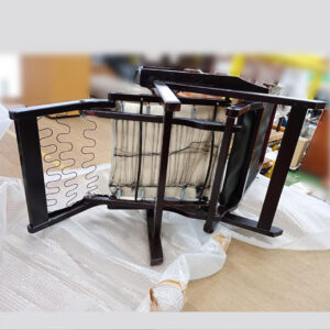 背板は劣化していたため新しく部材を製作し、本体の色に合わせて塗装を施して取り付け、下地のばねやワイヤーはゆがみがあったためこれらを撤去して下地用の補強布で張替えました。お好みではありますが、一般的にばねやワイヤーより生地による下地の方が体への当たりが柔らかく、座り心地がよいと感じられる方が多いようです。